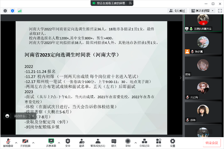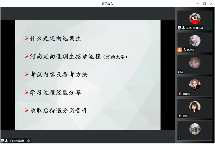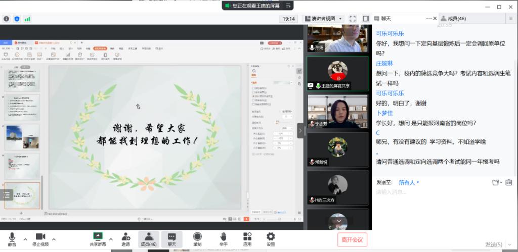 会上,王建首先分享了河南选调生宣传短片—青春闪耀,追梦中原,向大家普及了选调生的基本概念。他结合自身考试经验,从考试流程介绍、考试答题方法及技巧、面试礼仪和注意事项等方面进行了详细介绍,提醒同学们在笔试时应把握好时间分配,面试时注意回答问题的逻辑性、条理性,并对选调生待遇及分配岗位进行了细致讲解。在互动环节,王建就同学们在选调生考试备考过程中遇到的困难和疑惑进行了耐心解答,提供了多种高效备考资料和信息获取途径,线上会场气氛热烈。