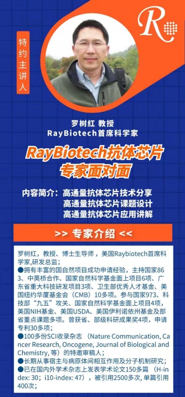 主讲人:罗树红 教授、博士生导师,美国Raybiotech首席科学家,研发总监;熟练的蛋白芯片,流式多因子芯片实验操作经验。参与多项国家自然科学基金项目,具有丰富的生物化学机制研究及技术应用经验。