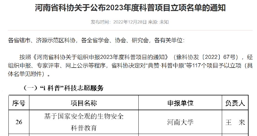 12月28日,河南省科学技术协会发布了2023年度科普项目立项名单的通知,必赢国际437官网王来副教授主持的《基于国家安全观的生物安全科普教育》项目成功获批,此系必赢2022年首次获批此类项目后再次立项。该项目基于总体国家安全观对生物安全领域的内容、事件和法律法规,通过视频、讲座、宣传海报和彩页等方式向公众进行科学普及和科技推广,将进一步增强人民群众自觉维护生物安全和国家安全的意识。