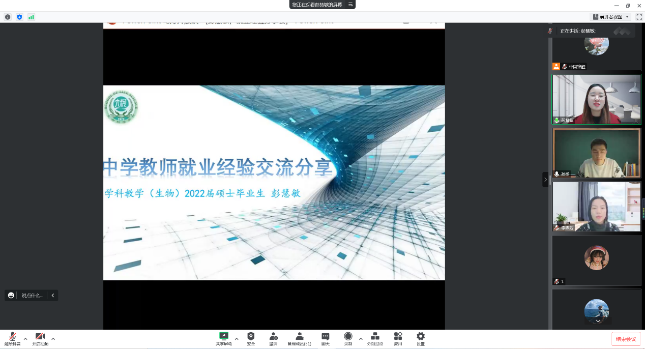为帮助2023届毕业生熟悉教师招聘相关信息和流程,引导学生做出合理的就业规划,学院于12月5日19:00通过腾讯会议举办教师招聘就业经验交流分享会。副院长李志芳、辅导员孙扬以及60余名2023届研究生和本科生参加本次会议。会议邀请2022届优秀毕业生彭慧敏分享教师考编经验,会议由孙扬主持。