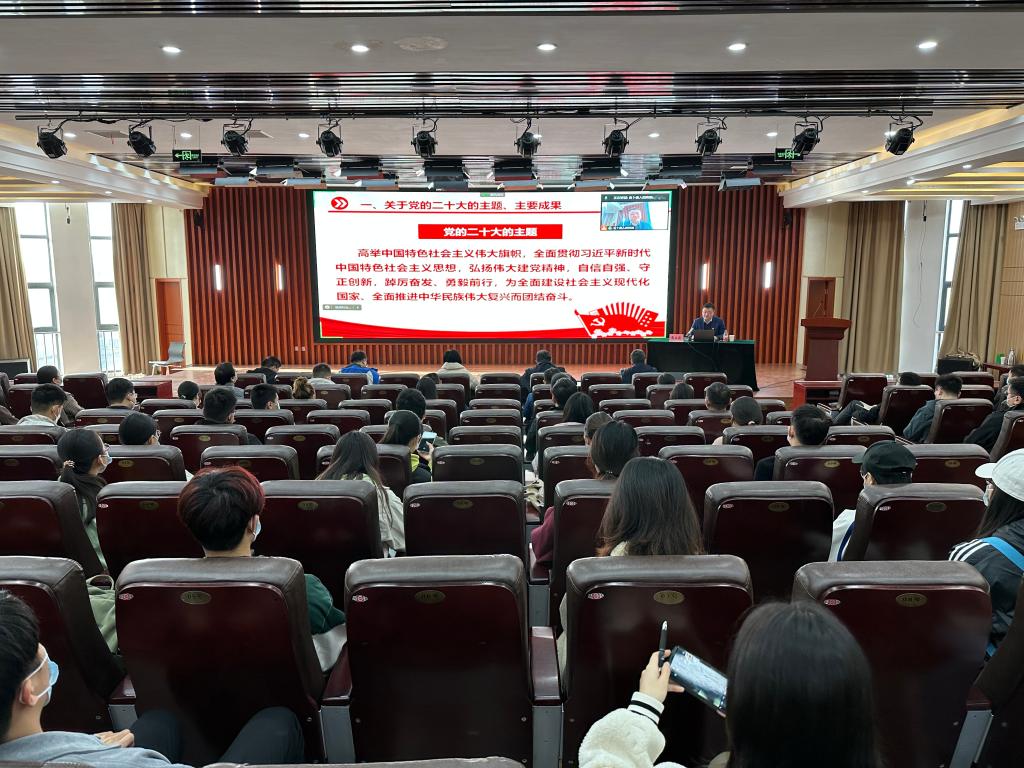 张立新围绕党的二十大主题、关于过去5年的工作和新时代10年的伟大变革、关于马克思主义中国化时代化、关于中国式现代化、关于全面建设社会主义现代化国家的目标任务、关于坚持党的全面领导和全面从严治党、关于应对风险挑战等七个方面展开宣讲。他强调,党的二十大报告站高谋远、气势恢宏、博大精深,进一步指明了党和国家事业的前进方向,是我们党团结带领全国各族人民在新时代新征程坚持和发展中国特色社会主义的政治宣言和行动纲领。要全面贯彻习近平新时代中国特色社会主义思想,弘扬伟大建党精神,踔厉奋发、勇毅前行,为全面建设社会主义现代化国家、全面推进中华民族伟大复兴贡献磅礴的教育力量。