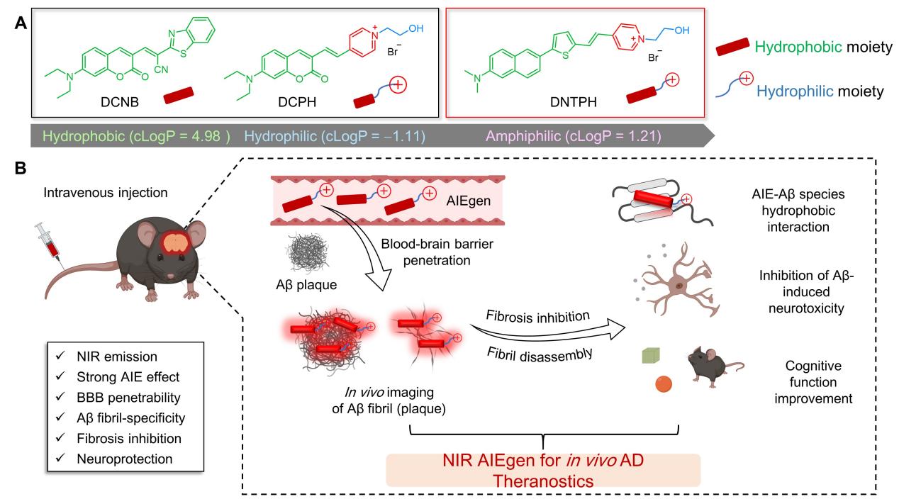 具有聚集诱导发光(AIE)性质的多功能探针,因其聚集态下的高亮度、光稳定性和高信噪比等优点,在蛋白聚集体检测领域备受关注。近期,实验室与香港中文大学等合作,通过合理调控AIE探针的官能团以平衡其亲脂性,开发了一种新型近红外发光的AIE探针。该分子不仅具有高效BBB穿越性,能实时、长效监测AD小鼠脑部的Aβ斑块,还具有Aβ纤维化抑制作用,可以缓解Aβ蛋白引起的神经毒性,有效抑制AD小鼠的斑块形成,恢复其记忆和行为能力。该成果充分展示了工程化设计的AIE诊疗分子在阿尔茨海默症的早期诊断和有效治疗方面具有巨大潜力和临床转化价值。