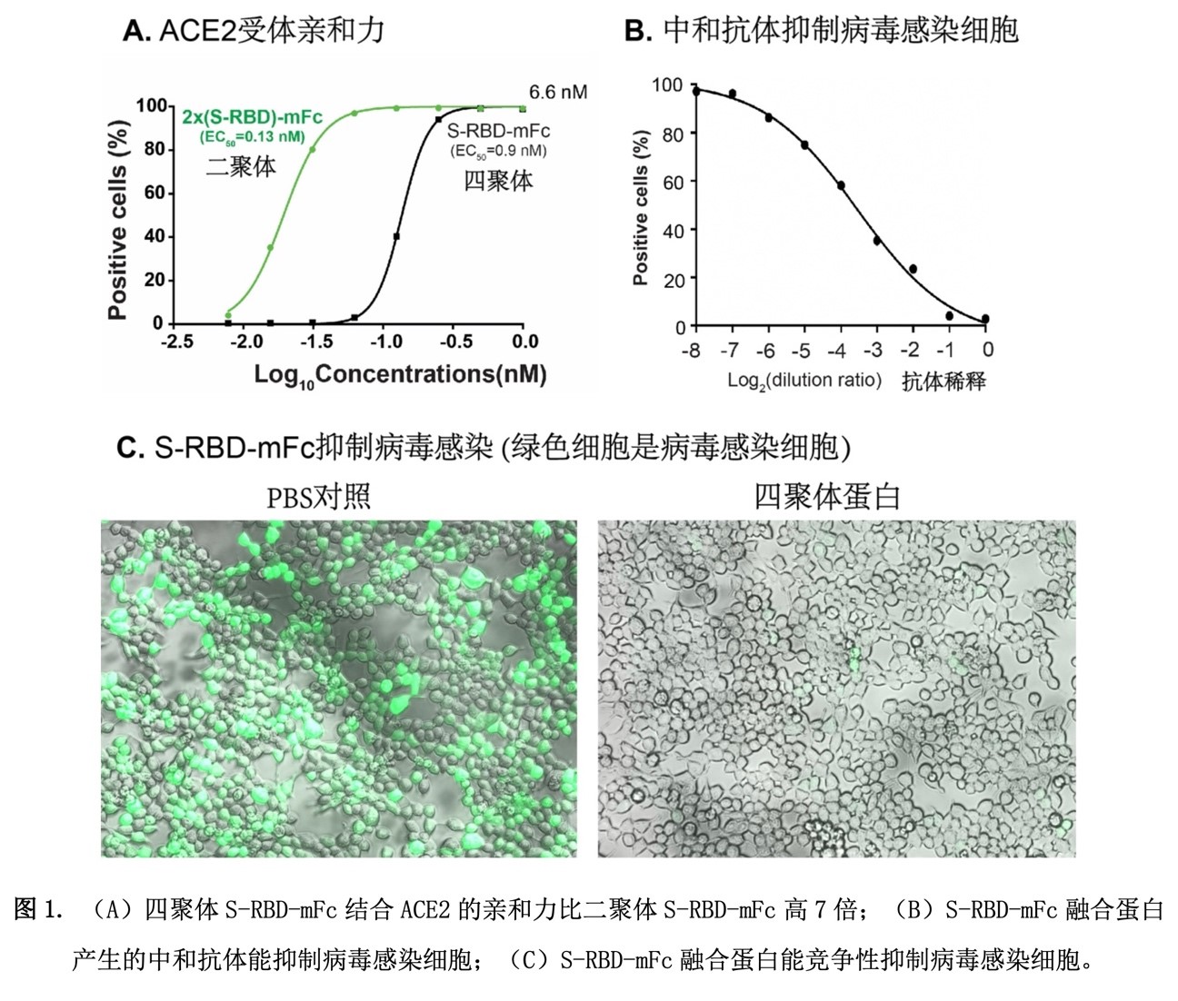 王彦明教授团队对COVID-19病毒触棘(S)蛋白的受体结合区域(RBD)进行研究,开发了具有自主知识产权的四聚体S-RBD-Fc抗体融合蛋白,建立了安全的假病毒感染HEK293T-hACE2细胞体外研究体系。研究发现,通过竞争抑制S-RBD和其细胞表面受体ACE2的结合,四聚体S-RBD-Fc抗体融合蛋白在0.13 nM浓度下能抑制50%的假病毒感染,抑制活性比二聚体S-RBD-Fc抗体融合蛋白高7倍。同时发现,抗体融合蛋白免疫小鼠后产生的S-RBD中和抗体能有效抑制假病毒的感染能力,并且对新出现的变种Omicron S蛋白假病毒具有抑制作用。抗体融合蛋白通过给药后能直接抑制病毒感染和后期产生中和抗体两个机制,实现“一石二鸟”的预防和治疗效果。四聚体S-RBD-Fc抗体融合蛋白具有更高的受体亲和力等技术优势,为应对现有新冠病毒及其新变种提供了一个潜在的周期短、灵活、有效的抗体融合蛋白研发方向。
