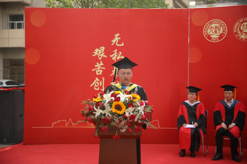 毕业是学生亲手酿的老酒,将甜美与苦涩定格在了青春最美的时刻,浅尝回忆,满是不舍。毕业生代表2018级生物工程专业李印深情回顾了四年的大学时光,青春的脚步留在校园的小路上,笑语欢歌珍藏在生科的晨昏中,衷心地感谢老师们的悉心培育。他表示,作为“双一流”建设高校毕业生和新时代青年,要主动承担历史使命和时代责任,牢记和弘扬百折不挠、自强不息;无私奉献、艰苦创业的新时期河大精神。“我们要牢记习近平总书记嘱托,做坚定的理想追求者、增强本领的奋进者、躬身实践的行动者和勇于担当的搏击者。”