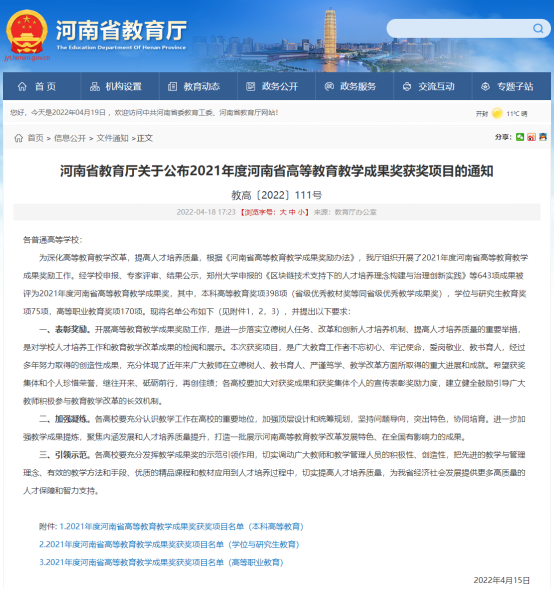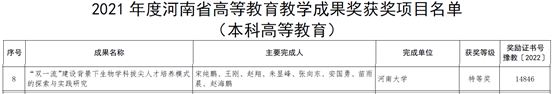 4月18日,河南省教育厅公布2021年度河南省高等教育教学成果奖获奖项目名单,宋纯鹏教授主持完成的“‘双一流’建设背景下生物学科拔尖人才培养模式的探索与实践研究”荣获特等奖。这是必赢“基于科教协作‘菁英计划’的地方高校拔尖创新人才培养模式研究与实践”项目获2019年度河南省高等教育教学成果特等奖之后,在拔尖人才培养方面取得的又一重要成果。项目实施与组织申报得到了学校有关领导、教务处等部门的悉心指导和大力支持。