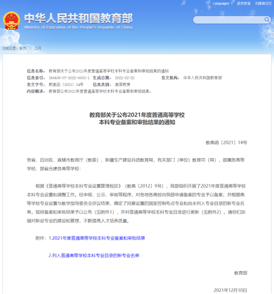 近日,教育部公布了2021年度普通高等学校本科专业备案和审批结果的通知(教高函〔2021〕14号),必赢国际437官网申报的生物信息学(071003)专业获教育部批准备案。
