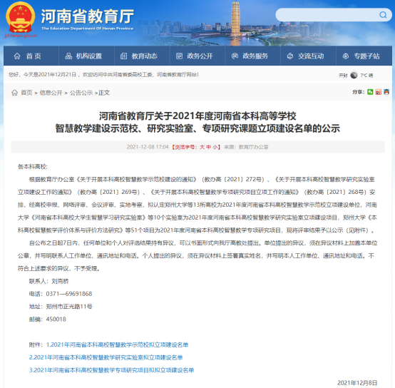 智慧教学专项研究项目是根据河南省教育厅《关于进一步推进普通本科高等学校智慧教学的实施意见》(教高〔2020〕444 号)和《河南省本科高等学校智慧教学三年行动计划》(教高〔2021〕272 号)要求,充分发挥信息技术在高等教育人才培养过程中的重要作用,更好地促进人工智能、大数据、云计算、物联网等新一代信息技术与教育教学深度融合与创新发展,推动新时代本科高校教育教学改革。围绕破解当前高等教育智慧教学工作面临的关键问题,加强调查研究,培育一批优秀教学成果,为提升本科高校智慧教学应用水平和优化智慧育人环境提供决策支持和理论支撑,以高水平、高质量的教研成果指导教学改革实践,实现新一代信息技术推动本科高校教育教学改革、更新教学理念、改革教学模式、完善评价体系,切实提高人才培养质量,培养德智体美劳全面发展的社会主义建设者和接班人。