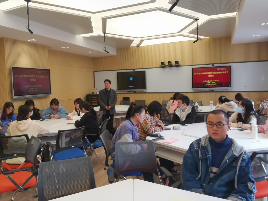 10月12日上午,2018级生物科学(师范)专业首批教育实习动员会于学院智慧教室举行,学院副院长赵海鹏,生物科学系主任刘凌云,副主任、实习队长肖保林,2018级辅导员李靖宇,全体实习学生参加会议,会议由刘凌云主持。
