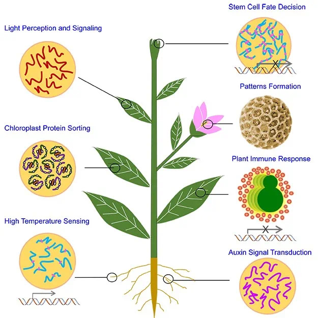 该论文综述了蛋白质发生相分离的分子决定因素及其调控机制,重点讨论了相分离参与的植物特有的生物学过程,主要包括以下几个方面:(1)光合作用CO2浓缩机制;(2)光信号的感知和信号转导;(3)细胞内蛋白分选与转运;(4)响应温度和昼夜节律;(5)感知水势变化调控种子萌发;(6)干细胞命运决定;(7)花粉细胞壁形态的形成;(8)水杨酸、生长素等激素信号转导。该论文强调了相分离是细胞区室化的一种保守和有效的机制,它可以对不同的代谢过程和信号通路进行精确的时空调控,特别有利于植物这种固着生物快速有效地感知并响应周围环境的变化。同时,提出了相分离研究领域需要解决的问题,并对未来研究方向提出展望。