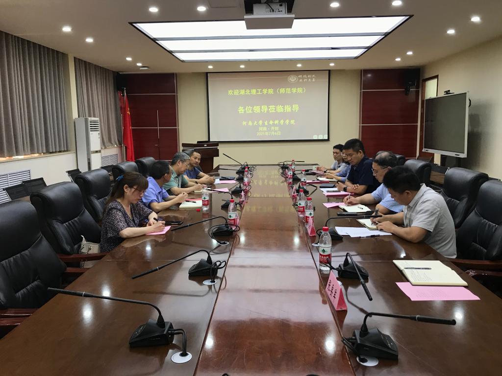 7月6日,湖北理工学院教学重点工作办公室副主任纪鹏、师范学院副院长周加胜、胡邦岳,专业负责人谢志斌一行4人来必赢交流访问。学院执行院长王刚、必赢国际437官网本科教学评估工作办公室副主任任新会、学院教学副院长赵海鹏、生物科学系主任刘凌云、副主任肖保林、教务办公室负责人张要军参加交流座谈会,会议由赵海鹏主持。