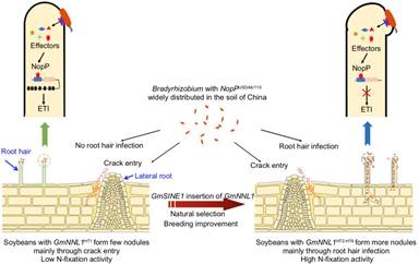2021年1月15日,必赢国际437官网王学路教授团队和华中农业大学李友国教授合作在Nature Plants上发表了题为“Glycine max NNL1 restricts symbiotic compatibility with bradyrhizobia via root hair infection in soybean”的研究论文(doi : 10.1038/s41477-020-00832-7),揭示了大豆与根瘤菌共进化过程中根瘤菌由裂隙侵染向根毛侵染方式转变的遗传、分子和进化机制。研究人员首先构建了来自于世界各地的496份大豆核心种质自然变异群体;再根据接种慢生型根瘤菌后根瘤数目的表型,进一步通过全基因组关联分析结合遗传分析和分子生物学的方法,定位并证明了一个编码TIR-NBS-LRR蛋白的R基因(命名为GmNNL1,Nodule Number Locus 1)能够限制根瘤菌侵染大豆,降低大豆的根瘤数目。进一步分析发现,在大豆的自然选择、人工驯化以及与根瘤菌的共进化过程中,一类GmSINE1转座子的插入导致了该基因功能失活,使其只能编码截短形式的GmNNL1蛋白,从而促进了大豆对土壤中土著根瘤菌的识别,增加了大豆根瘤数量,进而显著提高了大豆单株固氮酶活以及地上部分生物量。GmNNL1主要在根毛中受根瘤菌诱导表达并主要影响根瘤菌的根毛侵染途径,而具有转座子插入的GmNNL1失活单倍型的出现,是导致根瘤菌侵染大豆由裂缝侵染向根毛侵染转变的重要原因。进一步通过质谱鉴定、生化和遗传分析发现,全长的GmNNL1蛋白通过与根瘤菌的三型分泌系统效应蛋白NopP直接相互作用激活ETI从而抑制大豆与根瘤菌的共生。该研究不仅揭示了大豆与根瘤菌互作过程中宿主与寄主匹配性的遗传和分子机制,还阐释了根瘤菌与大豆共进化过程中根瘤菌由裂缝侵染演化成高效的根毛侵染过程的重大分子事件,也为大豆高效固氮的分子设计育种提供了重要理论依据和目标基因。