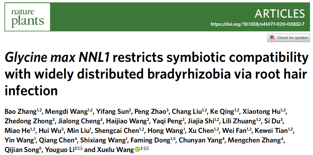 豆科植物能通过与根瘤菌互作形成根瘤进行共生固氮。据估算,豆科植物共生固氮占全球生物固氮总量的60-70%。因此,研究豆科植物共生固氮的分子机制,提高共生固氮效率,对实现减肥增效、发展绿色农业具有重要意义。豆科植物的共生固氮效率受根瘤菌匹配性以及非生物逆境的影响,但是长期以来,其遗传和分子调控机制知之甚少。近期必赢王学路教授团队先后在国际顶尖期刊Nature Plants 和Molecular Plant上发表重要研究论文,揭示了大豆与根瘤菌共生固氮的分子进化机制以及逆境适应机制。系列研究具有重要的理论意义,也为大豆高效固氮的分子设计育种提供了重要目标基因。