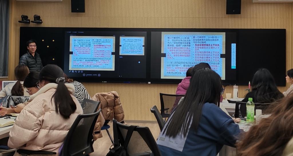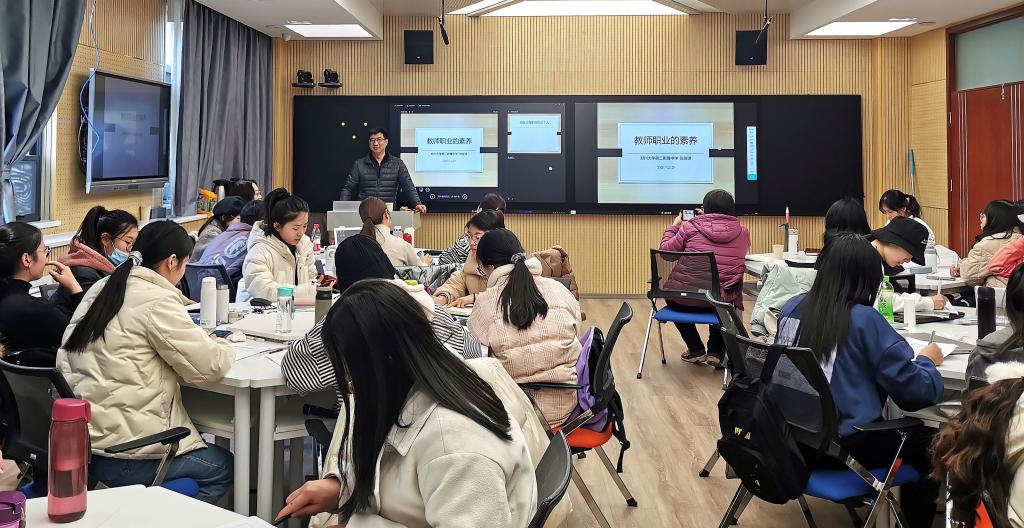 报告中,张老师分别从“什么是好老师、新时代中小学教师职业行为十项准则、课堂教学中的态势语以及教态”几方面进行讲述。张老师重点讲解了如何在课堂教学中使用态势语,态势语又包含表情语、手势语和姿态语。在课堂教学过程中要注重自己的仪表、服饰和体态,还为大家提供了教师招聘的一些信息。报告会结束以后,同学们积极提问,张老师也依据自己的实践经验给出建议,现场氛围融洽。